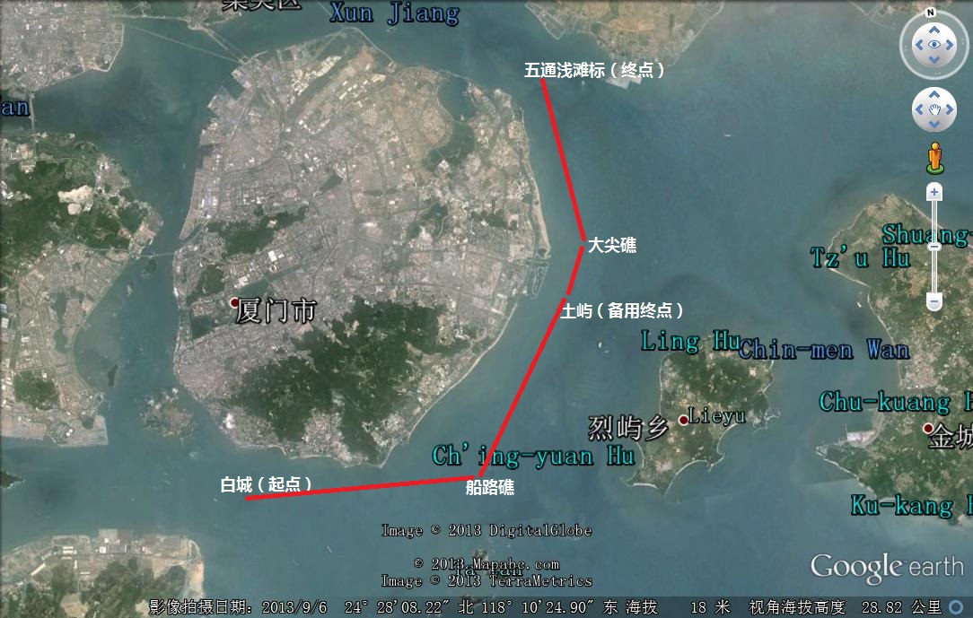拉力賽起點:廈大白城外海(起點) ——(1標(biāo):紅旗左舷繞,綠旗右舷繞)——轉(zhuǎn)折點:24°24′47.7″N,118 °09′10.6″E(船路礁燈標(biāo))——轉(zhuǎn)折點:土嶼三個黃色燈標(biāo)(備用終點)——大尖礁燈標(biāo)——五通淺灘標(biāo)(終點)——五緣灣大橋