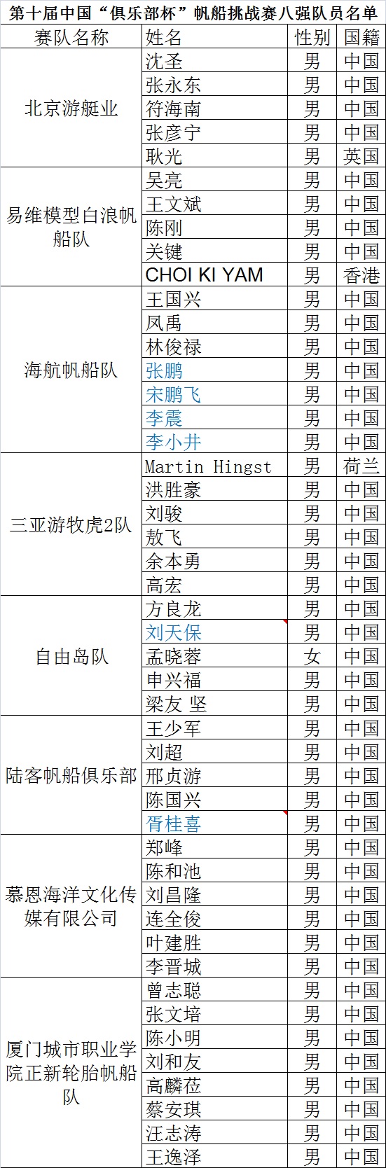 第十屆中國“俱樂部杯”帆船挑戰(zhàn)賽八強隊員名單