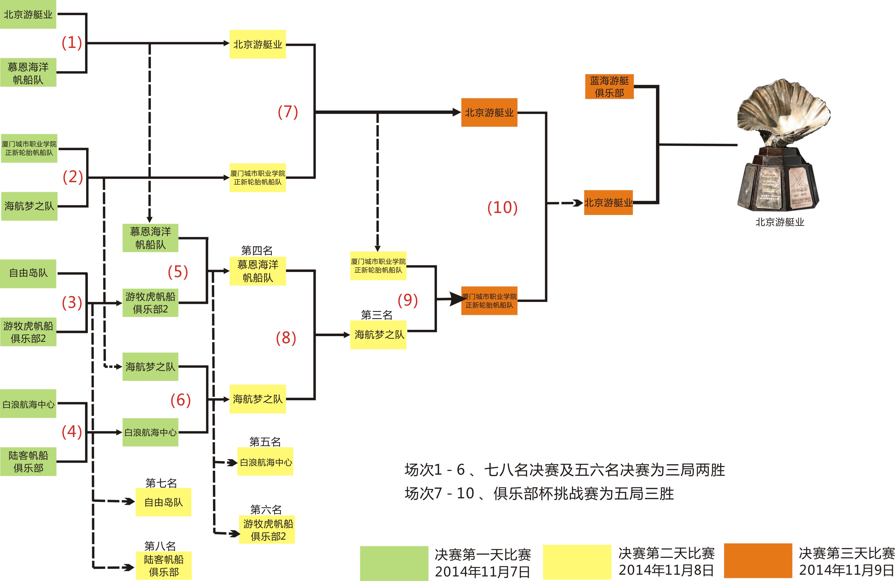 北京游艇業(yè)帆船隊(duì)取得了與上屆冠軍廈門藍(lán)海帆船俱樂部挑戰(zhàn)的資格,并且挑戰(zhàn)成功,成為了本屆俱樂部杯的最后贏家捧起了代表中國大帆船最高競技水平的中國“俱樂部杯”大貝殼獎(jiǎng)杯。