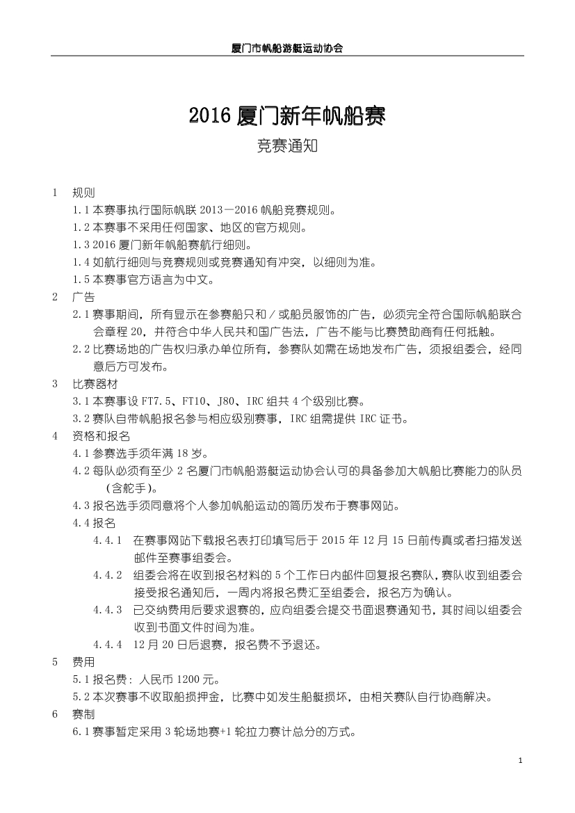 >2016廈門(mén)新年帆船賽競(jìng)賽通知